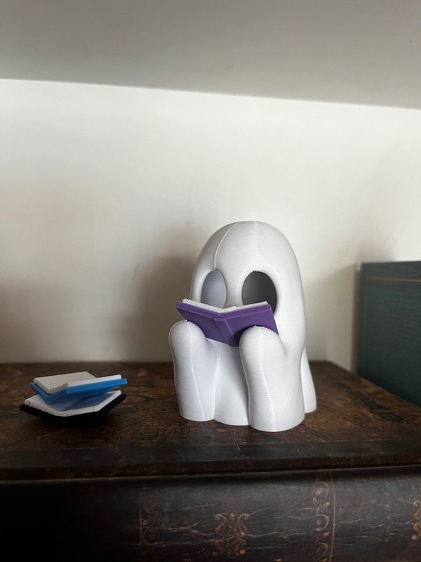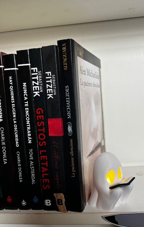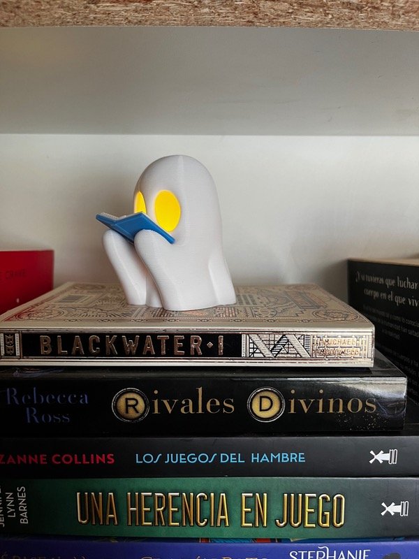 Un compañero de lectura muy especial: este fantasmita lector ilumina mientras sostiene su librito, creando un detalle único y adorable para tu biblioteca.